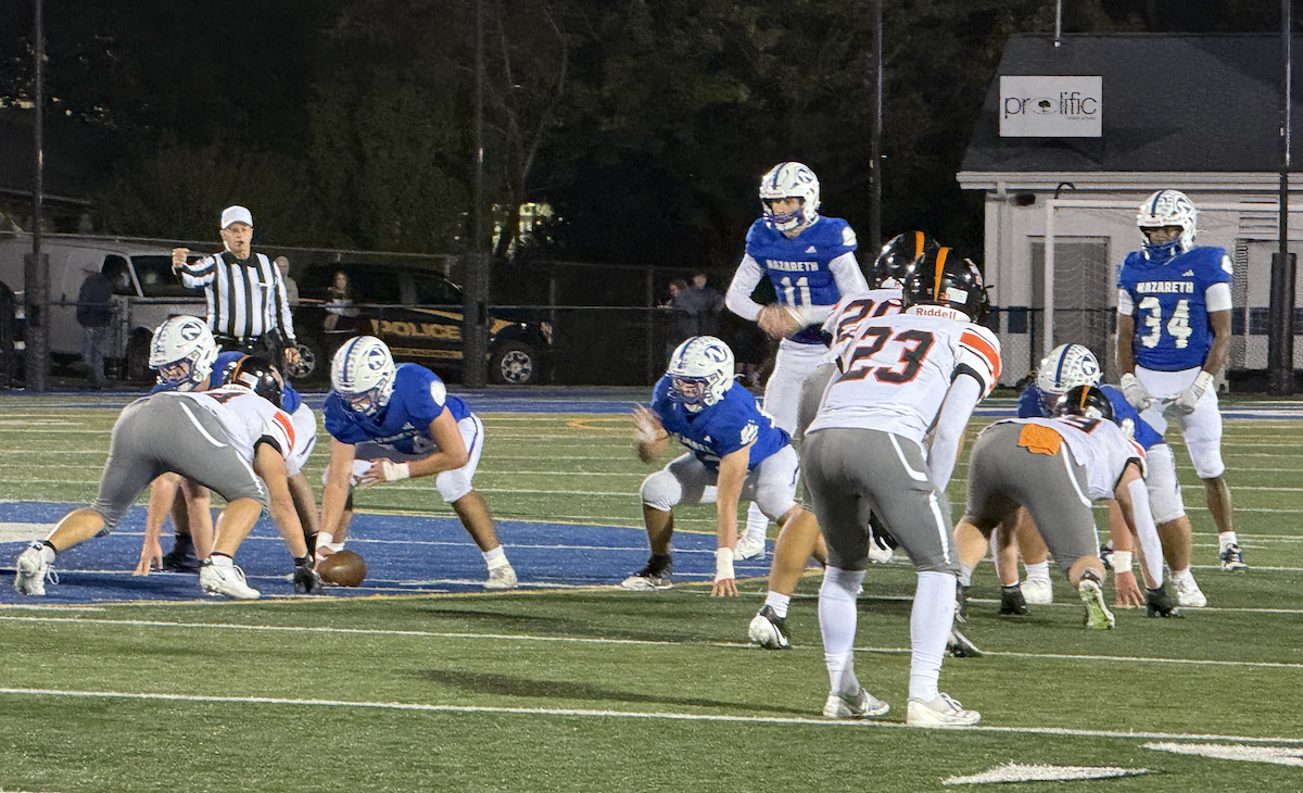 He took a short pass, made his move, and showed his breakaway speed in a 72-yard touchdown. That was his fourth touchdown of the first half. Nazareth led 26-14 at halftime.